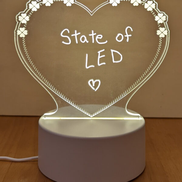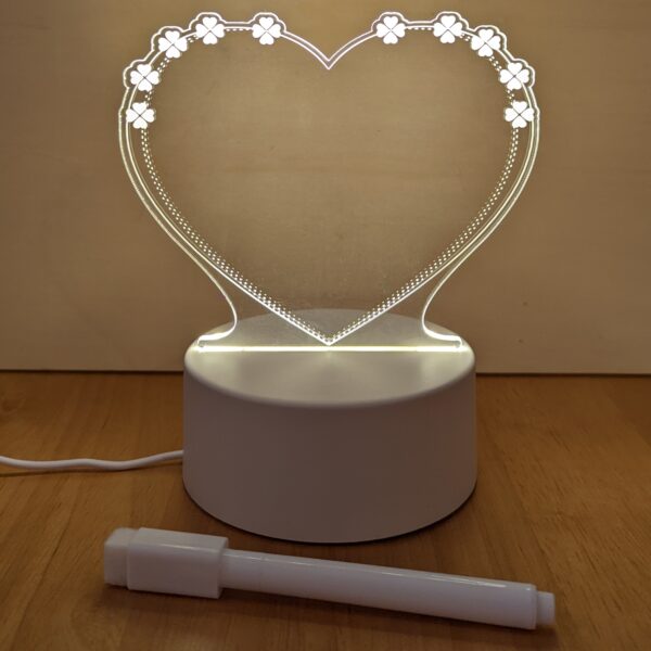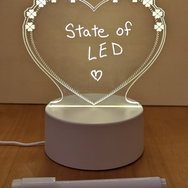 This heart shaped LED bottom lit transparent acrylic message board with marker pen is the perfect way to get your message across!  This is a heart shaped, clear, transparent acrylic message.  The flower pattern on top and outline of the heart is etched onto the board. Use the included erasable white marker pen, or your own dry erase markers to draw or write.  After writing your message, light up the board for a great effect!  Plug in the USB Type A connector to your computer, wall adapter, or battery pack to illuminate. The bright white light is perfect for darkened rooms.  Erases easily with attached pen eraser, a dry marker eraser, or water/cleaning solution and paper towel.  This little board can be used anywhere, from a college student’s desk to a kid’s bedroom nightstand to a restaurant counter.  The compact size makes it a great fit anywhere!