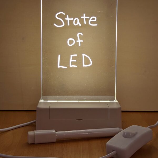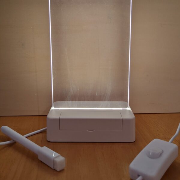 This rectangular LED bottom lit transparent acrylic message board with marker pen is the perfect way to get your message across! This is a clear, transparent acrylic message. Choose a solid round base or a rectangular base with small storage drawer. Use the included erasable white marker pen, or your own dry erase markers to draw or write. After writing your message, light up the board for a great effect! The included USB connector to your computer, wall adapter, or battery pack. The bright white light is perfect for darkened rooms! Erases easily with attached pen eraser, a dry marker eraser, or water and paper towel. This little board can be used anywhere, from a college student’s desk to a kid’s bedroom nightstand to a restaurant counter. The compact size makes it a great fit anywhere!